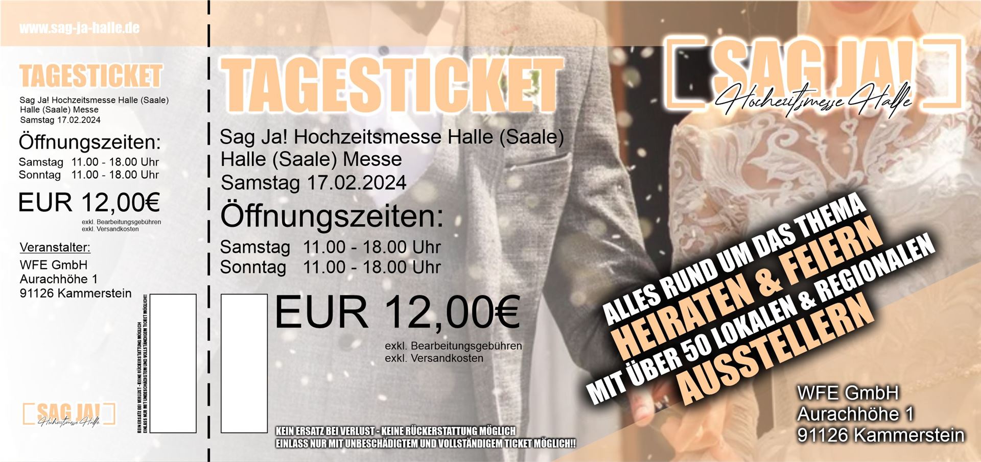 1 Tagesticket für die Sag Ja! Hochzeitsmesse am 17./18.02.2024 in der Messe Halle (Saale). Öffnungszeit jeweils von 11-18 Uhr. Ticket ist ganztägig für Ihren ausgewählten Tag gültig (Sonntag 18.02.2024).